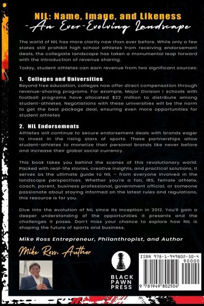 NIL: Name, Image, and Likeness - An Ever-Evolving Landscape The world of NIL has more clarity now than ever before. While only a few states still prohibit high school athletes from receiving endorsement deals, the collegiate landscape has taken a monumental leap forward with the introduction of revenue sharing. Today, student-athletes can earn revenue from two significant sources: Colleges and Universities: Beyond free education, colleges now offer direct compensation through revenue-sharing programs. For example, Major Division I schools with football programs have allocated $22 million to distribute among student-athletes. Negotiations with these universities will be the norm to get the best package deal, ensuring even more opportunities for student-athletes. NIL Endorsements: Athletes will continue to secure endorsement deals with brands eager to invest in the rising stars of sports. These partnerships allow student-athletes to monetize their personal brands like never before, and increase their global social currency. This book takes you behind the scenes of this revolutionary world. Packed with real-life stories, creative insights, and practical solutions, it serves as the ultimate guide to NIL - from everyone involved in the landscape perspectives. Whether you're a fan, IRS, female athlete, coach. parent, business professional, government official, or someone passionate about staying informed on the latest rules and regulations, this resource is for you. Dive into the evolution of NIL since its inception in 2012. You'll gain a deeper understanding of the opportunities it presents and the challenges it poses. Don't miss your chance to explore how NIL is shaping the future of sports and business.