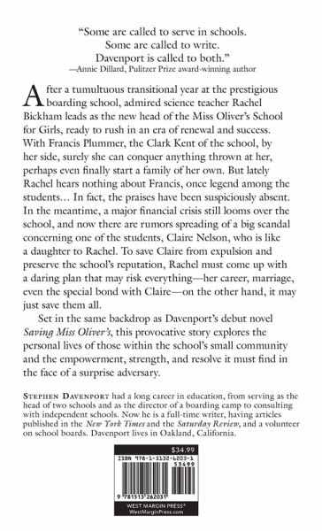 Set in the backdrop of a prestigious all-girls boarding school, this provocative novel explores the personal lives of those within the school's small community and the empowerment, strength, and resolve it must find in the face of a surprise adversary. After a tumultuous transitional year at the prestigious boarding school, Rachel Bickham now leads as the new head of Miss Oliver's School for Girls, ready to rush in an era of renewal and success. With beloved teacher Francis Plummer by her side, surely she can conquer anything thrown at her, perhaps even finally start a family of her own. But lately Rachel hears nothing about Francis's classes, once legend among the students. . . In fact, the praises have been suspiciously absent. In the meantime, financial crisis still looms over the school, and now there are rumors spreading of a big scandal concerning one of the students, Claire Nelson, who is like a daughter to Rachel. To save Claire from expulsion and preserve the school's reputation, Rachel must come up with a daring plan that may risk everything--her career, marriage, even the special bond with Claire--but it may just save them all. This is the follow-up to Davenport's first novel, Saving Miss Oliver's.