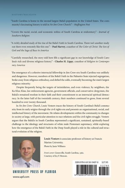 The emergence of a cohesive interracial fellowship in Jim Crow-era South Carolina was unlikely and dangerous. However, members of the Bahá’í Faith in the Palmetto State rejected segregation, broke away from religious orthodoxy, and defied the odds, eventually becoming the state’s largest religious minority. The religion, which emphasizes the spiritual unity of all humankind, arrived in the United States from the Middle East at the end of the nineteenth century via urban areas in the Northeast and Midwest. Expatriate South Carolinians converted and when they returned home, they brought their newfound religion with them. Despite frequently being the targets of intimidation, and even violence, by neighbors, the Ku Klux Klan, law enforcement agencies, government officials, and conservative clergymen, the Bahá’ís remained resolute in their faith and their commitment to an interracial spiritual democracy. In the latter half of the twentieth century, their numbers continued to grow, from several hundred to over twenty thousand. In No Jim Crow Church, Louis Venters traces the history of South Carolina’s Bahá’í community from its early origins through the civil rights era and presents an organizational, social, and intellectual history of the movement. He relates developments within the community to changes in society at large, with particular attention to race relations and the civil rights struggle. Venters argues that the Bahá’ís in South Carolina represented a significant, sustained, spiritually-based challenge to the ideology and structures of white male Protestant supremacy, while exploring how the emergence of the Bahá’í Faith in the Deep South played a role in the cultural and structural evolution of the religion.