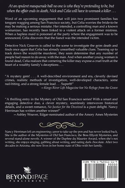 At an opulent masquerade ball no one is who they're pretending to be, but when the affair ends in death, Nick and Celia will have to unmask a killer . . . Word of an upcoming engagement that will join two prominent families has tongues wagging among San Francisco society, but Celia worries the bride-to-be may be making a serious mistake. Her intended, a controlling man and a known womanizer, has recently been linked to a violent attack on a former mistress. When a hapless maid is poisoned at the party where the engagement was to be announced, Celia discovers that the fiancé was the intended victim. Detective Nick Greaves is called to the scene to investigate the grim death and finds once again that Celia has already unearthed valuable clues. Teaming up to track down the would-be murderer, they soon determine that any number of people had reason to do away with the man. And when another young woman is found dead, Celia realizes that cornering the killer may expose a cruel truth at the heart of a wealthy family's deceptions . . . Praise for the Mysteries of Old San Francisco: "Nancy Herriman gives us another twisty Old San Francisco mystery that will keep you guessing until the very end. Readers won't be able to put this one down until they know who the killer is." -Victoria Thompson, USA Today bestselling author of Murder on Bedford Street "A mystery Ggem! . . . A well-described environment and era, cleverly devised crimes, realistic methods of investigation, well-developed characters, some nail-biting, and a strong female lead . . . Superb!" -Kings River Life Magazine for No Refuge from the Grave "A thrilling entry in the Mystery of Old San Francisco series! With a smart and engaging detective duo, a clever mystery, seamlessly interwoven historical details, and a sweet romance, No Justice for the Deceived is a pure delight. Nancy Herriman has written another winner!" -Ashley Weaver, Edgar-nominated author of the Amory Ames Mysteries