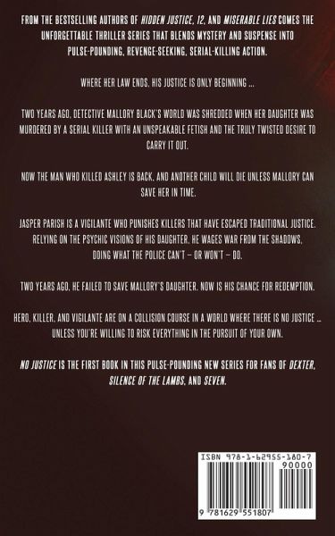 From the bestselling authors of Hidden Justice, 12, and Miserable Lies comes the unforgettable thriller series that blends mystery and suspense into pulse-pounding, revenge-seeking, serial-killing action. Where her law ends, his justice is only beginning ... Two years ago, detective Mallory Black's world was shredded when her daughter was murdered by a serial killer with an unspeakable fetish and the truly twisted desire to carry it out. Now the man who killed Ashley is back, and another child will die unless Mallory can save her in time. Jasper Parish is a vigilante who punishes killers that have escaped traditional justice. Relying on the psychic visions of his daughter, he wages war from the shadows, doing what the police can't - or won't - do. Two years ago, he failed to save Mallory's daughter. Now is his chance for redemption. Hero, killer, and vigilante are on a collision course in a world where there is no justice ... unless you're willing to risk everything in the pursuit of your own. No Justice is the first book in this pulse-pounding new series for fans of Dexter, Silence of the Lambs, and Seven.