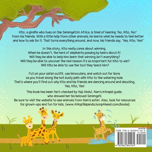 Kito, a giraffe who lives on the Serengeti in Africa, is tired of hearing 'No, Kito, No!' from his friends. With a little help from other animals, he learns what he needs to feel better and how to ask for it. That turns everything around, and now, his friends say, 'Yes, Kito, Yes!' In this story, Kito really cares about winning. When he doesn't, the herd of elephants passing by hears about it! Will they be able to help him learn that winning isn't everything? Will they be able to uncover the real reason it's so important for Kito to win? Will Kito be able to use the tool they teach him? Put on your safari outfit, use binoculars, and watch out for lions as you travel along the hot dusty path with Kito to the watering hole. That's where you'll find out why Kito and his friends are dancing around and shouting, Yes, Kito, Yes! This book has been fact-checked by Haji Abdul, Nan's intrepid guide, who showed her his beloved Serengeti. Be sure to visit the website to see animals from Nan's safari. Also, look for resources for grown-ups and fun for kids. (www. AHopSkipandaJumpAhead.com/books)
