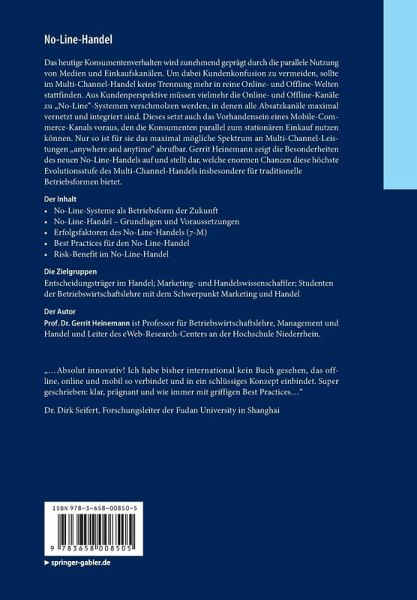 "[...] existenziell wichtige Antworten auf fundamentale Herausforderungen für den Handel." www.channelpartner.de, 08.03.2013 "No-Line-Handel: Höchste Evolutionsstufe im Multi-Channeling Auf 280 Seiten verrät der Autor Gerrit Heinemann, Leiter des eWeb Research Center und Professor für Betriebswirtschaftslehre an der Hochschule Niederrhein, Multi-Channel-Unternehmen, wie sie die Evolution von Multi-Channel Richtung No-Line-Handel schaffen. Dabei werden nicht nur die möglichen Ausprägungen von No-Line-Handel anhand zahlreicher Beispiele erklärt, sondern auch unternehmerische Voraussetzungen erläutert, Vorteile und Risiken dargestellt sowie eine Roadmap Richtung No-Line-Handel entworfen." Internet World BUSINESS