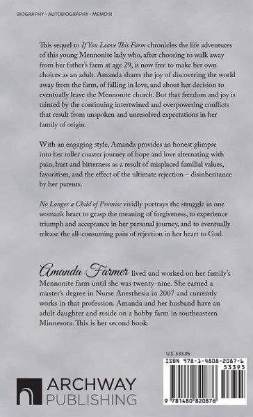 This sequel to If You Leave This Farm chronicles the life adventures of this young Mennonite lady who, after choosing to walk away from her father's farm at age 29, is now free to make her own choices as an adult. Amanda shares the joy of discovering the world away from the farm, of falling in love, and about her decision to eventually leave the Mennonite church. But that freedom and joy is tainted by the continuing intertwined and overpowering conflicts that result from unspoken and unresolved expectations in her family of origin. With an engaging style, Amanda provides an honest glimpse into her roller coaster journey of hope and love alternating with pain, hurt and bitterness as a result of misplaced familial values, favoritism, and the effect of the ultimate rejection - disinheritance by her parents. No Longer a Child of Promise vividly portrays the struggle in one woman's heart to grasp the meaning of forgiveness, to experience triumph and acceptance in her personal journey, and to eventually release the all-consuming pain of rejection in her heart to God.
