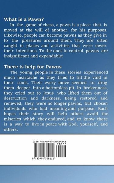 No Longer a Pawn, is a collection of biographical stories that have been written to enlighten and encourage young people as they begin to make choices for their own lives. These stories tell how young teens entered the adult world, naive and unprepared to resist the pressures around them to conform to "group think." They became the pawns of others, being used and abused without hope for change. When they finally sought help to break from the destructive paths their lives had taken. many were in their late twenties; some were at least forty years old. Much of their lives had been lived behind a masked smile, while in their hearts and minds they were miserable, lonely and empty. Broken in spirit. they cried out to Jesus, who lifted them out of their pits of destruction, and filled their lives with meaning and purpose. By telling their story, each individual hopes to help other young people avoid the pitfalls and miseries they experienced, and to know there is a way to live in peace with God, yourself, and others.