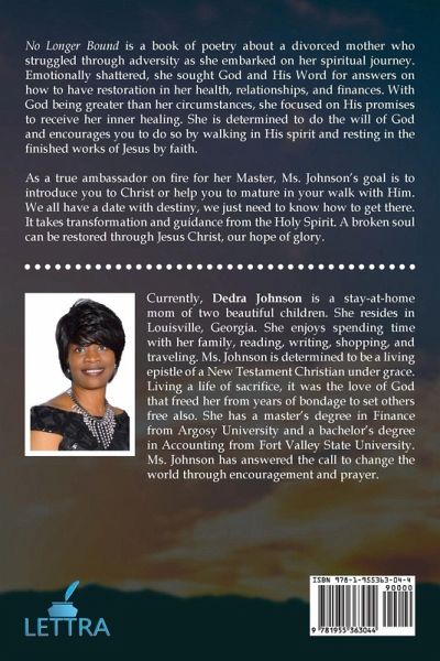 No Longer Bound is a book of poetry of a divorced mother who struggled through adversity as she embarked her spiritual journey. Emotionally shattered, she sought God and His Word for answers on how to have restoration in her health, relationships, and finances. With God being greater than her circumstances, she focused on His promises to receive her inner healing. She is determined to do the will of God and encourages you to do so by walking in His spirit and resting in the finished works of Jesus by faith. As a true ambassador on fire for her Master, Ms. Johnson's goal is to introduce you to Christ or help you to mature in your walk with Him. We all have a date with destiny, we just need to know how to get there. It takes transformation and guidance from the Holy Spirit. A broken soul can be restored through Jesus Christ, our hope of glory. "He heals the brokenhearted and binds up their wounds." -Psalms 147:3 (NKJV) ¿Currently, Dedra Johnson is a stay-at-home mom of two beautiful children. She resides in Louisville, Georgia. She enjoys spending time with her family, reading, writing, shopping, and traveling. Ms. Johnson is determined to be a living epistle of a New Testament Christian under grace. Living a life of sacrifice, it was the love of God that freed her from years of bondage to set others free also. She has a master's degree in Finance from Argosy University and a bachelor's degree in Accounting from Fort Valley State University. Ms. Johnson has answered the call to change the world through encouragement and prayer.
