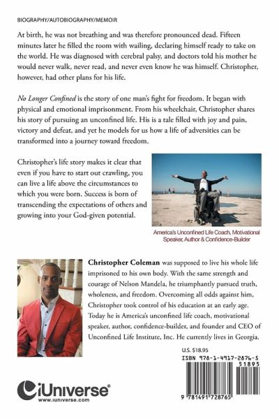 At birth, he was not breathing and was therefore pronounced dead. Fifteen minutes later he filled the room with wailing, declaring himself ready to take on the world. He was diagnosed with cerebral palsy, and doctors told his mother he would never walk, never read, and never even know he was himself. Christopher, however, had other plans for his life. No Longer Confined is the story of one man?s fight for freedom. It began with physical and emotional imprisonment. From his wheelchair, Christopher shares his story of pursuing an unconfined life. His is a tale filled with joy and pain, victory and defeat, and yet he models for us how a life of adversities can be transformed into a journey toward freedom. Christopher?s life story makes it clear that even if you have to start out crawling, you can live a life above the circumstances to which you were born. Success is born of transcending the expectations of others and growing into your God-given potential.