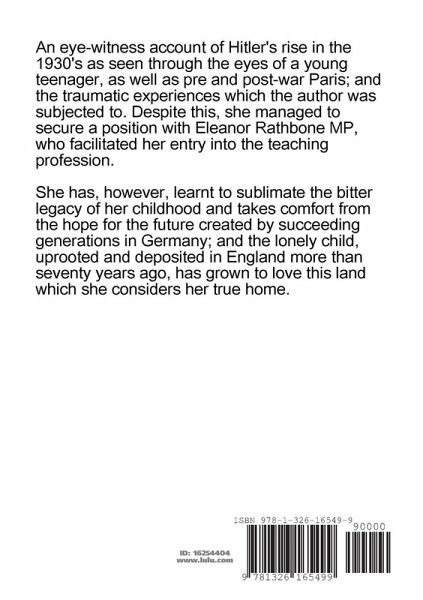 An autobiographical account of a young girl's life from 1930 to 1989, covering her time in Germany during Hitler's rise to power, and subsequently time in both pre and post-war Paris, moving eventually to London, where she settled,trained as a teacher, and met her husband George, and now considers her home.Since retiring she has written several books,including this one in German: "Frankfurt-meine erste Heimat" which she took to schools for reading and discussion in Germany.