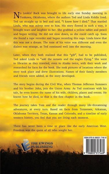No Lookin' Back was brought to life early one Sunday morning in Tonkawa, Oklahoma, where the authors Ted and Linda Riddle lived. Ted sat straight up in bed and said, "I know how I died." That startled Linda, who was asleep next to him. His story flowed in such a way, it brought tears and laughter to her. She grabbed a yellow tablet and pencil and began writing. He did not slow down, so she could catch up. Soon she found a tape recorder and began recording this saga. Linda knew that this was not a dream. The tone of his voice was different and even the dialect was strange, as Ted continued well into the morning. Later, when they both realized that this "gift", had to be published, Ted asked Linda to "add the sunsets and the eagles flying." She went to libraries as they traveled, even to Alaska twice, with their work and researched for facts for the book. She took pictures of locations where the story took place and drew illustrations. Names of their family members and friends were added, as the story developed. The story begins during the Civil War, when Thomas Jefferson Summers and his brother John, join the Union Army. As Ted continues with his tale, he even knows the name of his wife, children, places and events. He knows how he died, so that is the first chapter in the book. The journey takes Tom and the reader through many life-threatening adventures, at every turn. Based on facts from Tennessee, Arkansas, Oklahoma Territory, Texas, Kansas and Colorado, and a timeline of early western history, you feel that you are living each moment. There has never been a time or place like the early American West. Freedom was the quest of all who sought her.