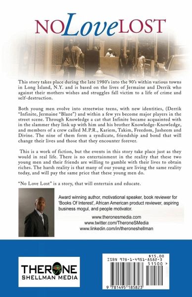 The story takes place during the late 1980’s into the 90’s within various towns in Long Island, N.Y. and is based on the lives of Jermaine and Derrik who against their mothers wishes and struggles fall victim to a life of crime and self-destruction. Both young men evolve into streetwise teens, with new identities, (Derrik "Infinite", Jermaine "Blaze"), and within a few yrs become major players in the street scene. Through Knowledge a cat that Inifinite became acquainted with in the slammer they link up with him and his brother Knowledge Knowledge, and members of a crew called M.P.R., Kareem, Takim, Freedom, Jasheem and Divine. The nine of them form a syndicate, friendship and bond that will change their lives, and those they encounter forever. This is a work of fiction, but the events in this story take place just as they would in real life. There’s no entertainment in the reality that these two young men and their friends are willing to gamble with their lives to obtain riches. The harsh reality is that many of our young are living the same reality today, and will pay the same price that these young men do. "No Love Lost" is a story, which will entertain and educate