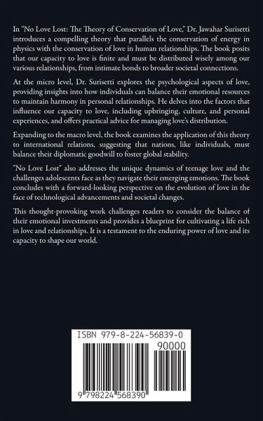 In "No Love Lost: The Theory of Conservation of Love," Dr. Jawahar Surisetti introduces a compelling theory that parallels the conservation of energy in physics with the conservation of love in human relationships. The book posits that our capacity to love is finite and must be distributed wisely among our various relationships, from intimate bonds to broader societal connections. At the micro level, Dr. Surisetti explores the psychological aspects of love, providing insights into how individuals can balance their emotional resources to maintain harmony in personal relationships. He delves into the factors that influence our capacity to love, including upbringing, culture, and personal experiences, and offers practical advice for managing love's distribution. Expanding to the macro level, the book examines the application of this theory to international relations, suggesting that nations, like individuals, must balance their diplomatic goodwill to foster global stability. "No Love Lost" also addresses the unique dynamics of teenage love and the challenges adolescents face as they navigate their emerging emotions. The book concludes with a forward-looking perspective on the evolution of love in the face of technological advancements and societal changes. This thought-provoking work challenges readers to consider the balance of their emotional investments and provides a blueprint for cultivating a life rich in love and relationships. It is a testament to the enduring power of love and its capacity to shape our world.