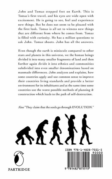 John and Tomaz stepped feet on Earth. This is Tomaz's first travel, and his eyes are wide open with excitement. He is going to see, feel, and experience new things. But he does not seem to be pleased with the first look. Tomaz is all set to witness new things that are different from where he comes from. Tomaz is filled with curiosity. He has a million questions to ask John. Tomaz shoots. John has all the answers. Even though the earth is miniscule compared to other stars and planets in this universe, we the human beings divided it into many smaller fragments of land and then further again divide it into ethnics and communities subdivided into even smaller denominations based on manmade differences. John analyzes and explains, how some countries apply and use common sense to improve their countries living standards and provide a better environment for its inhabitants and at the same time some countries use the worst possible methods of planning & construction which leads to the path of self-destruction, "They claim that the souls go through evolution."