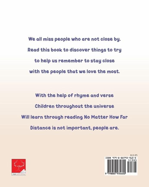 We all miss people who are not close by. Read this book to discover things to try to help us remember to stay close with the people that we love the most. With the help of rhyme and verse Children throughout the universe Will learn through reading No Matter How Far Distance is not important, people are.