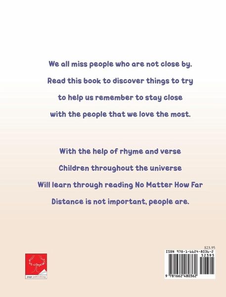 We all miss people who are not close by. Read this book to discover things to try to help us remember to stay close with the people that we love the most. With the help of rhyme and verse Children throughout the universe Will learn through reading No Matter How Far Distance is not important, people are.