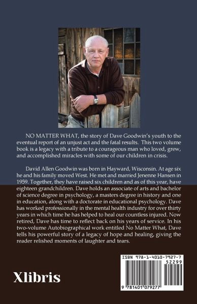 NO MATTER WHAT David A Goodwin Normal MTomolonis 2 2 2003-04-14T20:57:00Z 2003-04-14T20:57:00Z 2 664 3789 31 7 4653 9.2720 NO MATTER WHAT, VOLUMES ONE AND TWO, tells the life story of Dr. David Goodwin from his birth to his retirement from the mental health profession at age sixty three. Goodwin's tells of his difficulty in dealing with his childhood education and his dislike of academia in general. However, he managed to overcome his early educational difficulties eventually earning a bachelors degree, two masters degrees and a doctorate degree. Goodwin says he was born with horse manure in his blood and that he wanted to be a rancher and cowboy for as long as he could remember. He spent much of his young life on farms and wanting to spend the rest of his life in the in the saddle. Goodwin says that when he was a kid in high school he was privileged to spend several years working nights as a houseparent at a school for the deaf and blind. He writes about that experience and says it taught him to be responsible and to have empathy for others. Goodwin's written work shares his early efforts to gain a military career and how the military shaped