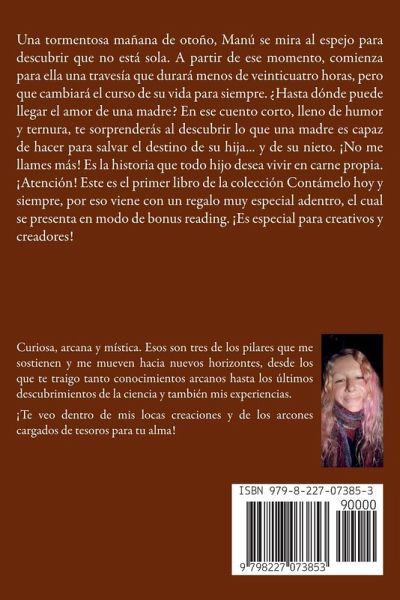 Una tormentosa mañana de otoño, Manú se mira al espejo para descubrir que no está sola. A partir de ese momento, comienza para ella una travesía que durará menos de veinticuatro horas, pero que cambiará el curso de su vida para siempre. ¿Hasta dónde puede llegar el amor de una madre? En ese cuento corto, lleno de humor y ternura, te sorprenderás al descubrir lo que una madre es capaz de hacer para salvar el destino de su hija... y de su nieto. ¡No me llames más! Es la historia que todo hijo desea vivir en carne propia. ¡Atención! Este es el primer libro de la colección Contámelo hoy y siempre, por eso viene con un regalo muy especial adentro, el cual se presenta en modo de bonus reading. ¡Es especial para creativos y creadores!