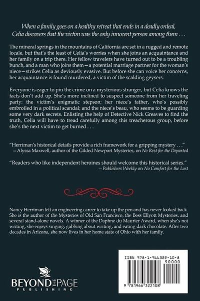When a family goes on a healthy retreat that ends in a deadly ordeal, Celia discovers that the victim was the only innocent person among them . . .The mineral springs in the mountains of California are set in a rugged and remote locale, but that's the least of Celia's worries when she joins an acquaintance and her family on a trip there. Her fellow travelers have turned out to be a troubling bunch, and a man who joins them-a potential marriage partner for the woman's niece-strikes Celia as deviously evasive. But before she can voice her concerns, her acquaintance is found murdered, a victim of the scalding geysers. Everyone is eager to pin the crime on a mysterious stranger, but Celia knows the facts don't add up. She's more inclined to suspect someone from her traveling party: the victim's enigmatic stepson; her niece's father, who's possibly embroiled in a political scandal; and the niece's beau, who seems to be guarding some very dark secrets. Enlisting the help of Detective Nick Greaves to find the truth, Celia will have to tread carefully among this treacherous group, before she's the next victim to get burned . . .Praise for the Mysteries of Old San Francisco:"Readers who like independent heroines should welcome this historical series." -Publishers Weekly on No Comfort for the Lost"Weaving together an intriguing mystery and a fascinating clash of cultures, No Comfort for the Lost will keep readers turning the pages long into the night." -Anna Lee Huber, bestselling author of the Lady Darby Mysteries"Nancy Herriman gives us another twisty Old San Francisco mystery that will keep you guessing until the very end. Readers won't be able to put this one down until they know who the killer is." -Victoria Thompson, USA Today bestselling author of Murder on Bedford Street"A mystery gem! . . . A well-described environment and era, cleverly devised crimes, realistic methods of investigation, well-developed characters, some nail-biting, and a strong female lead . . . Superb!" -Kings River Life on No Refuge from the Grave"A thrilling entry in the Mystery of Old San Francisco series! With a smart and engaging detective duo, a clever mystery, seamlessly interwoven historical details, and a sweet romance, No Justice for the Deceived is a pure delight. Nancy Herriman has written another winner!" -Ashley Weaver, Edgar-nominated author of the Amory Ames Mysteries