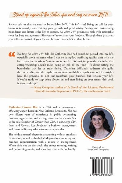 Society tells us that we need to be available 24/7. This isn't true! Being on call for your business is actually undermining your growth and productivity. Setting and maintaining boundaries and limits is the key to success. No More 24/7 provides a path with actionable steps for busy entrepreneurs like yourself to reclaim your freedom. Through these exercises, you will take control of your life and become more efficient than before. In this book, you will learn: How to use your mental capacity to schedule efficiently How to set and maintain boundaries How to use tools and automations for success When to multitask for different activities When to hire and allocate work How to be both consistent and flexible in various situations How to perform periodic self-evaluation to improve processes How to avoid the fatal combo Stand up against the status quo and say no more 24/7!