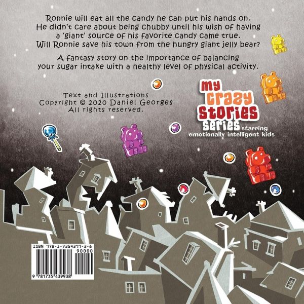 Hide your candy... Hide them all from Ronnie! Ronnie loves being lazy... and eating candy. Actually, all the candy in the world is not enough for him! When a hungry giant jelly bear threatens to devour all his town, his bad habits will need to change. Ronnie has to jump, run and outsmart the giant bear. Will he save his town? A candylicious picture book that will have kids bravely face their lazy sugar cravings, even if they are as big as Ronnie's giant jelly bear... If Ronnie can, they can too! What will children learn from this book? A healthy lifestyle can be taught to kids at an early age with lifelong positive effects on both body and mind. Using self-projection storytelling, this children's book will encourage kids to confidently conquer the 'big bear' that represents their own laziness and bad eating habits. Let's eat healthy and stay active! BOOK 4 from the quirky series MY CRAZY STORIES - Children's book Age 3-8 Read also Book 5: This Cat Is Mine! on Sharing and Teamwork. What makes My Crazy Stories series quite special is that it focuses on kids' character building by encouraging young readers to develop a deeper awareness of themselves and cultivate emotional confidence as they grow up. Enjoy reading!