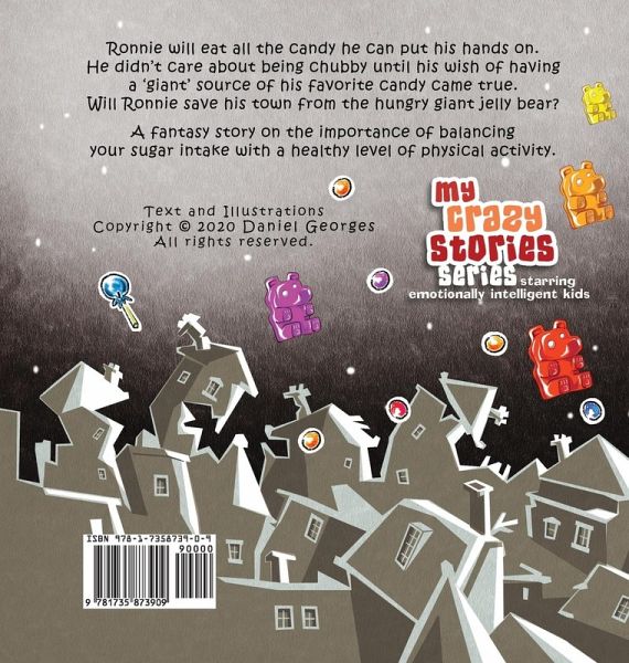 Hide your candy... Hide them all from Ronnie! Ronnie loves being lazy... and eating candy. Actually, all the candy in the world is not enough for him! When a hungry giant jelly bear threatens to devour all his town, his bad habits will need to change. Ronnie has to jump, run and outsmart the giant bear. Will he save his town? A candylicious picture book that will have kids bravely face their lazy sugar cravings, even if they are as big as Ronnie's giant jelly bear... If Ronnie can, they can too! What will children learn from this book? A healthy lifestyle can be taught to kids at an early age with lifelong positive effects on both body and mind. Using self-projection storytelling, this children's book will encourage kids to confidently conquer the 'big bear' that represents their own laziness and bad eating habits. Let's eat healthy and stay active! BOOK 4 from the quirky series MY CRAZY STORIES - Children's book Age 3-8 Read also Book 5: This Cat Is Mine! on Sharing and Teamwork. What makes My Crazy Stories series quite special is that it focuses on kids' character building by encouraging young readers to develop a deeper awareness of themselves and cultivate emotional confidence as they grow up. Enjoy reading!