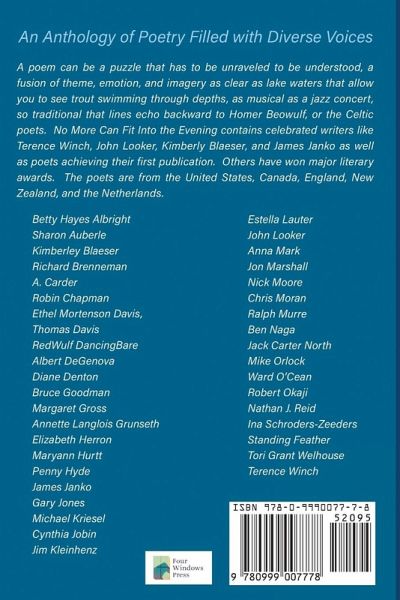 No More Will Fit Into the Evening contains poetry by thirty-seven poets from five countries. The sub-title of the book is, "An Anthology of Diverse Voices," and this is what the poet's in the volume represent. Poets from a diversity of backgrounds and places inevitably produce poems that are made distinct not only by their talent, but also by the experiences and visions that arise from that diversity. The diversity represented by this volume encompasses racial identity, sexual orientation, country of origin, and spiritual beliefs. There is no perfect way to look at the universe, but when all the ways of seeing what is are represented, then, at least from a human perspective, a fuller and truer image can emerge. The editors, the poets Thomas Davis and Standing Feather, asked each of the poets in the book for ten of the best poems they have ever written and then selected the poems that they considered exceptionally strong for conclusion. They wanted to honor the idea that a healthy sampling of a poet's work is better than a whiff that gives a slight taste of what the poet is all about. Some of the poets contained in the anthology have been published in some of the finest magazines and journals in the world. A few have won major awards for their poetry and their books and have an international audience. Others have never achieved publication outside of their personal blogs. Of special note is the inclusion of poets like Terence Winch, winner of the American and Columbia Books awards, among other major honors, the extraordinary Anishinabe poet Kimberly Blaeser, John Looker, one of England's most interesting poets, the environmentalist poet Robin Chapman, the award-winning novelist James Janko, and the jazz musician and founder of the literary journal After Hours, Albert DeGenova. These, and all the other poets included, have helped achieve what Davis and Feather wrote as their fondest wish in the Introduction, that readers might find themselves on a mesa top where grandmother junipers spread their branches out beneath a full moon, remembering poems that stuck in their spirit after this volume has been read. We are hoping they might have that experience in Door County, Wisconsin where Lake Michigan is tossing wild, white capped waves at the dark dolomite escarpment that runs through Door Peninsula, or maybe in the timeless moment when they are communing with Taliesin, the ancient Celtic bard, in a time before time as he chants beauty and the world's beauty into the deep starlight of a Celtic night. The list of poets included in the anthology are: Betty Hayes Albright, Sharon Auberle, Kimberly Blaeser, Richard Brenneman, A. Carder, Robin Chapman, Ethel Mortenson Davis, Thomas Davis, RedWulf DancingBare, Albert DeGenova, Diane Denton, Bruce Goodman, Margaret Gross, Annette Langlois Grunseth, Elizabeth Herron, Maryann Hurtt, Penny Hyde, James Janko, Gary Jones, Michael Kriesel, Cynthia Jobin, Jim Kleinhenz, Estella Lauter, John Looker, Anna Mark, Jon Marshall, Nick Moore, Chris Moran, Ralph Murre, Ben Naga, Jack Carter North, Mike Orlock, Ward O'Cean, Robert Okaji, Nathan J. Reid, Ina Schroders-Zeeder, Standing Feather, Tori Grant Welhouse, and Terence Winch.