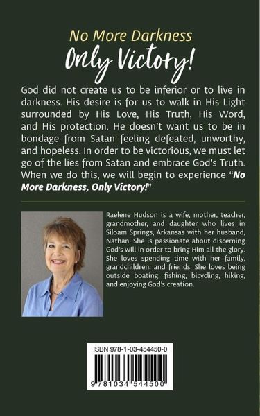 God did not create us to be inferior or to live in darkness. His desire is for us to walk in His Light surrounded by His Love, His Truth, His Word, and His protection. He doesn't want us to be in bondage from Satan feeling defeated, unworthy, and hopeless. In order to be victorious, we must let go of the lies from Satan and embrace God's Truth. When we do this, we will begin to experience "No More Darkness, Only Victory!"