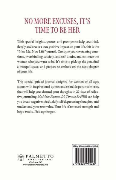 Prepare to embrace a new life of tranquility and confidence in yourself with this special guided journal designed to help you become the woman you want and deserve to be. This book is not your average new year's journal. This guided journal aims to help channel your thoughts toward recognizing and dealing with overacting emotions, overthinking, anxiety, and self-doubt. With this journal, you set out on the path to embracing the woman you were always meant to be. Pick up the pen, find a tranquil spot that gives you space to unpack your thoughts, and prepare to truly enjoy a new life where you are at ease and secure in yourself. No More Excuses... it's time to be HER! is the special journal for women of all ages who are tired of feeling stuck in their negative spirals. Break the cycle and create a positive impact in your life by exploring your innermost thoughts and answering the guided prompts. Complete with inspirational quotes and relatable personal stories from the author's life, No More Excuses... it's time to be HER! invites you to express yourself in 21 days of reflective journaling. Defy self-deprecating thoughts, understand your true value, and embark on the next chapter of your life with renewed strength and hope.
