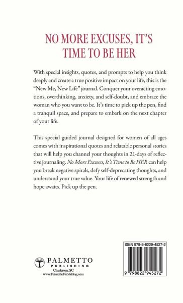 Prepare to embrace a new life of tranquility and confidence in yourself with this special guided journal designed to help you become the woman you want and deserve to be. This book is not your average new year's journal. This guided journal aims to help channel your thoughts toward recognizing and dealing with overacting emotions, overthinking, anxiety, and self-doubt. With this journal, you set out on the path to embracing the woman you were always meant to be. Pick up the pen, find a tranquil spot that gives you space to unpack your thoughts, and prepare to truly enjoy a new life where you are at ease and secure in yourself. No More Excuses... it's time to be HER! is the special journal for women of all ages who are tired of feeling stuck in their negative spirals. Break the cycle and create a positive impact in your life by exploring your innermost thoughts and answering the guided prompts. Complete with inspirational quotes and relatable personal stories from the author's life, No More Excuses... it's time to be HER! invites you to express yourself in 21 days of reflective journaling. Defy self-deprecating thoughts, understand your true value, and embark on the next chapter of your life with renewed strength and hope.