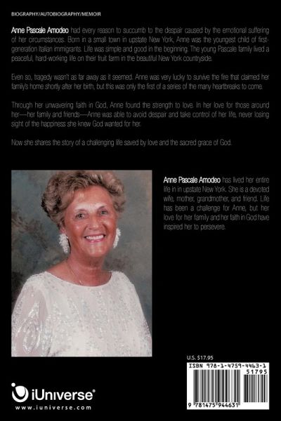 Anne Pascale Amodeo had every reason to succumb to the despair caused by the emotional suffering of her circumstances. Born in a small town in upstate New York, Anne was the youngest child of first-generation Italian immigrants. Life was simple and good in the beginning. The young Pascale family lived a peaceful, hard-working life on their fruit farm in the beautiful New York countryside. Even so, tragedy wasn't as far away as it seemed. Anne was very lucky to survive the fire that claimed her family's home shortly after her birth, but this was only the first of a series of the many heartbreaks to come. Through her unwavering faith in God, Anne found the strength to love. In her love for those around her-her family and friends-Anne was able to avoid despair and take control of her life, never losing sight of the happiness she knew God wanted for her. Now she shares the story of a challenging life saved by love and the sacred grace of God.