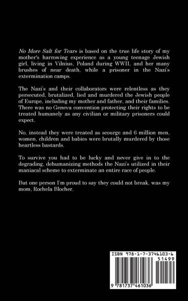 No More Salt for Tears is based on the true life story of my mother's harrowing experience as a young teenage Jewish girl, living in Vilnius, Poland during WWII, and her many brushes of near death, while a prisoner in the Nazi's extermination camps. The Nazi's and their collaborators were relentless as they persecuted, brutalized, lied and murdered the Jewish people of Europe, including my mother and father, and their families. There was no Geneva convention protecting their rights to be treated humanely as any civilian or military prisoners could expect. No, instead they were treated as scourge and 6 million men, women, children and babies were brutally murdered by those heartless bastards. To survive you had to be lucky and never give in to the degrading, dehumanizing methods the Nazi's utilized in their maniacal scheme to exterminate an entire race of people. But one person I'm proud to say they could not break, was my mom, Rochela Blocher.