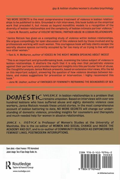 Myths: Violence is a male biological trait. When women fight, no one gets seriously hurt. Lesbians don't abuse their spouses. The truth revealed in Janice Ristock's groundbreaking book is that lesbian relationships sometimes do turn violent. Based on interviews with more than one hundred lesbians who have suffered abuse and seventy-five case workers, "No More Secrets" is a comprehensive account of this startling phenomenon. Although one in four gay and lesbian couples are affected by domestic violence, the problem has remained hidden for several reasons. First is the fear of homophobic backlash should lesbian violence be acknowledged. More significantly, Ristock argues, the lesbian feminist culture has readily adopted the idea that men are more violent than women in order to validate lesbian relationships. Recognizing abuse among lesbians would undermine the cemented belief that domestic abuse is an expression of patriarchy and gender bias. The definitive book on the subject, "No More Secrets" combines extensive research on the nature of lesbian battering with close-up analysis that will change our understanding of crimes of intimacy in heterosexual and homosexual couples alike. By giving voice to the victims, Ristock helps women to address violence by breaking silences, sharing secrets, and naming the forms of abuse.