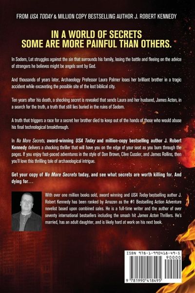 "James Acton: A little bit of Jack Bauer and Indiana Jones!" FROM USA TODAY & MILLION COPY BESTSELLING AUTHOR J. ROBERT KENNEDY IN A WORLD OF SECRETS SOME ARE MORE PAINFUL THAN OTHERS In Sodom, Lot struggles against the sin that surrounds his family, losing the battle and fleeing on the advice of strangers he believes might be angels sent by God. And thousands of years later, Archaeology Professor Laura Palmer loses her brilliant brother in a tragic accident while excavating the possible site of the lost biblical city. Ten years after his death, a shocking secret is revealed that sends Laura and her husband, James Acton, in a search for the truth, a truth that still lies buried in the ruins of Sodom. A truth that triggers a race for a secret her brother died to keep out of the hands of those who would abuse his final technological breakthrough. In No More Secrets, award-winning USA Today and million-copy bestselling author J. Robert Kennedy delivers a shocking thriller that will have you on the edge of your seat as you burn through the pages. If you enjoy fast-paced adventures in the style of Dan Brown, Clive Cussler, and James Rollins, then you'll love this thrilling tale of archaeological intrigue. Get your copy of No More Secrets today, and see what secrets are worth killing for. And dying for... About the James Acton Thrillers: ¿¿¿¿¿ "James Acton: A little bit of Jack Bauer and Indiana Jones!" Though this book is part of the James Acton Thrillers series, it is written as a standalone novel and can be enjoyed without having read any other installments. ¿¿¿¿¿ "Non-stop action that is impossible to put down." The James Acton Thrillers series and its spin-offs, the Special Agent Dylan Kane Thrillers and the Delta Force Unleashed Thrillers, span over 50 novels and have sold over one million copies. If you love non-stop action and intrigue with a healthy dose of humor, try James Acton today! ¿¿¿¿¿ "A great blend of history and current headlines."