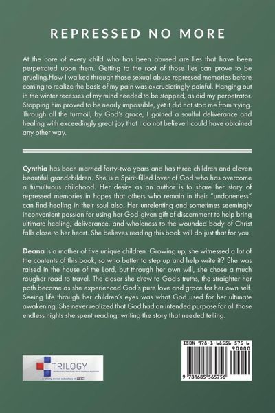 REPRESSED NO MORE At the core of every child who has been abused are lies that have been perpetrated upon them. Getting to the root of those lies can prove to be grueling. How I walked through those sexual abuse repressed memories before coming to realize the basis of my pain was excruciatingly painful. Hanging out in the winter recesses of my mind needed to be stopped, as did my perpetrator. Stopping him proved to be nearly impossible, yet it did not stop me from trying. Through all the turmoil, by God's grace, I gained a soulful deliverance and healing with exceedingly great joy that I do not believe I could have obtained any other way.