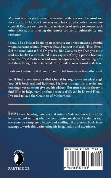 My book is a fun yet informative treatise on the essence of control and the craze for it! Do you know why man has created a device like remote control? Because we have similar tendencies of trying to control each other with authority using the remote control of vulnerability and reverence! I should be a boss or be riding an expensive car or be someone powerful whom everyone salutes! Everyone should respect me! Yeah! True! Even I feel the same! Ain't it fun? Do you feel like God already? Then you must read my book! I've considered many aspects of why a person becomes a control freak! Both men and women enjoy remote controlling now and then, though I have targeted the orthodox conventional male here! Both work related and domestic control led issues have been discussed. You'll find a new theory called Qua-Si by Yogi Si-a mystical yogi. Yogi Si is both real and fictitious. He lives through his theories and teachings, yet none can give you his address! But trust me; this theory is fun! With its help, many profound secrets of life can be known! Finally, I've tried to laud the Greatness of Motherhood.