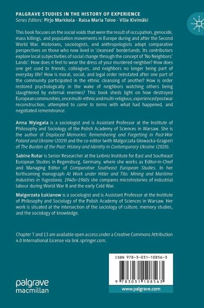 This book focuses on the social voids that were the result of occupation, genocide, mass killings, and population movements in Europe during and after the Second World War. Historians, sociologists, and anthropologists adopt comparative perspectives on those who now lived in 'cleansed' borderlands. Its contributors explore local subjectivities of social change through the concept of 'No Neighbors' Lands': How does it feel to wear the dress of your murdered neighbor? How does one get used to friends, colleagues, and neighbors no longer being part of everyday life? How is moral, social, and legal order reinstated after one part of the community participated in the ethnic cleansing of another? How is order restored psychologically in the wake of neighbors watching others being slaughtered by external enemies? This book sheds light on how destroyed European communities, once multi-ethnic and multi-religious, experienced postwar reconstruction, attempted to come to terms with what hadhappened, and negotiated remembrance. Chapter 7 and 13 are available open access under a Creative Commons Attribution 4.0 International License via link.springer.com.