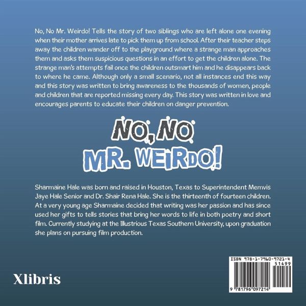 No, No Mr. Weirdo! Tells the story of siblings Jordan and Kate who are left alone one evening when their mother arrives late to pick them up from school. After their teacher steps away the children wander off to the playground where a strange man approaches them and asks them suspicious questions in an effort to get the children alone. The strange man's attempts fail once the children outsmart him and he disappears back to where he came. Although only a small scenario, not all instances end this way and this story was written to bring awareness to the thousands of women, people and children that are reported missing every day. This story was written in love and encourages parents to educate their children on danger prevention.