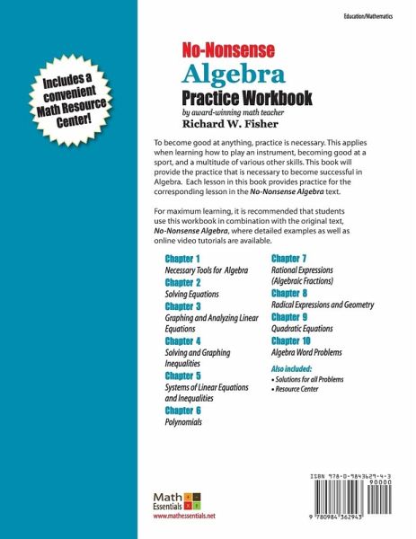 The perfect companion to the No-Nonsense Algebra text. Thousands of practice problems Specific practice for each lesson contained in No-Nonsense Algebra text Enhances understanding helps students build confidence Ensures that students master and retain what they have learned Includes a final review that covers all topics Excellent SAT test prep Solutions for every problem Includes a hand Algebra Resource Center This book will provide the practice that is necessary to become successful in Algebra. Each lesson in this book provides practice for the corresponding lesson the the text, No-Nonsense Algebra. For maximum learning, it is recommended that the student use this book in combination with the origianl text, No-Nonsense Algebra, where detailed examples as well as online video tutorials are available.