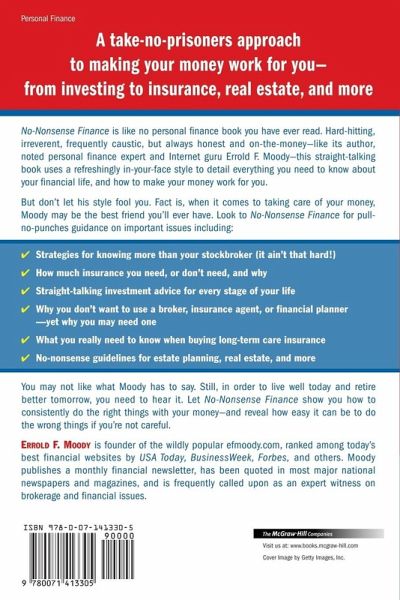 Today's most powerful personal finance website transfers its take-noprisoners approach to the printed page Errold Moody and his website efmoody.com have gained a substantial grassroots following--and praise from Forbes, Business- Week, USA Today, and others--for their straight-talking approach and hands-on guidance in all areas of personal finance. No-Nonsense Finance brings the website's wealth of information to a concise yet comprehensive guidebook, outlining a commonsense program for saving regularly, investing wisely, and resisting the impulse to buy unnecessary products and advice. From showing readers how to find advisers they can trust to dispelling myths about asset allocation, dollar-cost averaging, and more, No-Nonsense Finance is the ideal financial reference. Readers will enjoy, and profit from, Moody's irascible, often irreverent advice, including: * Why one should never buy stocks from a stockbroker * Basic estate planning issues demystified * "Caveat Investor" sidebars to highlight key points