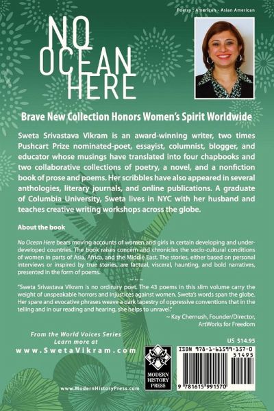 Brave New Collection Honors Women's Spirit Worldwide No Ocean Here bears moving accounts of women and girls in certain developing and underdeveloped countries. The book raises concern, and chronicles the socio-cultural conditions of women in parts of Asia, Africa, and the Middle East. The stories, either based on personal interviews or inspired by true stories, are factual, visceral, haunting, and bold narratives, presented in the form of poems. "Sweta Srivastava Vikram is no ordinary poet. The 44 poems in this slim volume carry the weight of unspeakable horrors and injustices against women. Sweta's words span the globe. Her spare and evocative phrases weave a dark tapestry of oppressive conventions that in the telling and in our reading and hearing, she helps to unravel." -- Kay Chernush, Founder/Director, ArtWorks for Freedom About the Author Sweta Srivastava Vikram is an award-winning writer, two times Pushcart Prize nominated-poet, novelist, author, essayist, columnist, and educator whose musings have translated into four chapbooks of poetry, two collaborative collections of poetry, a novel, and a non¬fiction book of prose and poems. Her work has appeared in several anthologies, literary journals, and online publications across six countries in three continents. A graduate of Columbia University, she reads her work, teaches creative writing workshops, and gives talks at universities and schools across the globe. Sweta lives in New York City with her husband. Learn more at www.SwetaVikram.com From the World Voices Series at Modern History Press www.ModernHistoryPress.com POE005060 Poetry : American - Asian American SOC028000 Social Science : Women's Studies - General FAM001000 Family & Relationships : Abuse - General