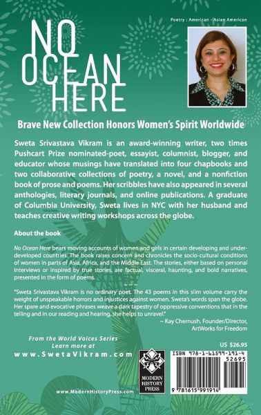 Brave New Collection Honors Women's Spirit Worldwide No Ocean Here bears moving accounts of women and girls in certain developing and underdeveloped countries. The book raises concern, and chronicles the socio-cultural conditions of women in parts of Asia, Africa, and the Middle East. The stories, either based on personal interviews or inspired by true stories, are factual, visceral, haunting, and bold narratives, presented in the form of poems. "Sweta Srivastava Vikram is no ordinary poet. The 44 poems in this slim volume carry the weight of unspeakable horrors and injustices against women. Sweta's words span the globe. Her spare and evocative phrases weave a dark tapestry of oppressive conventions that in the telling and in our reading and hearing, she helps to unravel." -- Kay Chernush, Founder/Director, ArtWorks for Freedom About the Author Sweta Srivastava Vikram is an award-winning writer, two times Pushcart Prize nominated-poet, novelist, author, essayist, columnist, and educator whose musings have translated into four chapbooks of poetry, two collaborative collections of poetry, a novel, and a non¬fiction book of prose and poems. Her work has appeared in several anthologies, literary journals, and online publications across six countries in three continents. A graduate of Columbia University, she reads her work, teaches creative writing workshops, and gives talks at universities and schools across the globe. Sweta lives in New York City with her husband. Available in hardcover, paperback, and eBook editions Learn more at www.SwetaVikram.com From the World Voices Series at Modern History Press www.ModernHistoryPress.com POE005060 Poetry : American - Asian American SOC028000 Social Science : Women's Studies - General FAM001000 Family & Relationships : Abuse - General