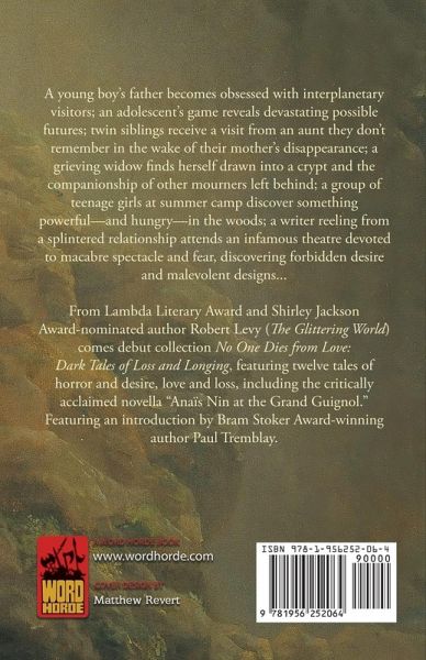 "Levy delivers a viscerally unsettling collection of 12 horror shorts rooted as much in human psychology as in the fantastical and speculative. [...] Levy's stories are made all the more powerful by his unwillingness to shy away from the illicit. By embracing the taboo with the tools of horror and speculative fiction, he at once demystifies these subjects while imbuing them with a magic of his own. [...] The result is a triumph." --Publishers Weekly, Starred Review A young boy's father becomes obsessed with interplanetary visitors; an adolescent's game reveals devastating possible futures; twin siblings receive a visit from an aunt they don't remember in the wake of their mother's disappearance; a grieving widow finds herself drawn into a crypt and the companionship of other mourners left behind; a group of teenage girls at summer camp discover something powerful-and hungry-in the woods; a writer reeling from a splintered relationship attends an infamous theatre devoted to macabre spectacle and fear, discovering forbidden desire and malevolent designs... From Lambda Literary Award and Shirley Jackson Award-nominated author Robert Levy (The Glittering World) comes debut collection No One Dies from Love: Dark Tales of Loss and Longing, featuring twelve tales of horror and desire, love and loss, including the critically acclaimed novella "Anaïs Nin at the Grand Guignol." Featuring an introduction by Bram Stoker Award-winning author Paul Tremblay.