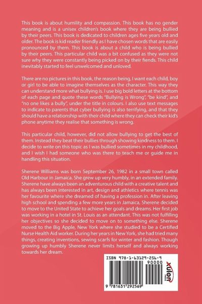 This book is about humility and compassion. This book has no gender meaning and is a unisex children's book where they are being bullied by their peers. This book is dedicated to children ages five years old and older. The book is kid reader friendly as I have chosen words that are easily pronounced by them. This book is about a child who is being bullied by their peers. This particular child was a bit confused as they were not sure why they were constantly being picked on by their fiends. This child inevitably started to feel unwelcomed and unloved. There are no pictures in this book, the reason being, I want each child, boy or girl to be able to imagine themselves as the character. This way they can understand more what bullying is. I use big bold letters at the bottom of each page and quote these words "Bullying is Wrong", "be kind", and "no one likes a bully", under the title in colours. I also use text messages to indicate to parents that cyber bullying is also terrifying, and that they should have a relationship with their child where they can check their kid's phone anytime they realise that something is wrong. This particular child, however, did not allow bullying to get the best of them. Instead they beat their bullies through showing kindness to them. I decide to write on this topic as I was bullied sometimes in my childhood, and I wish I had someone who was there to teach me or guide me in handling this situation. Sherene Williams was born September 26, 1982 in a small town called Old Harbour in Jamaica. She grew up very humbly, in an extended family. Sherene have always been an adventurous child with a creative talent and has always been interested in art, design and athletics where tennis was her favourite where she dreamed of having a profession in. After leaving high school and spending a few more years in Jamaica, Sherene decided to move to the United State to achieve her goals and dreams. Her first job was working in a hotel in St. Louis as an attendant. This was not fulfilling her objectives so she decided to move on to something else. Sherene moved to the Big Apple, New York where she studied to be a Certified Nurse Health Aid worker. During her years in New York, she had tried many things, creating inventions, sewing scarfs for winter and fashion. Though growing up humbly Sherene never limits herself and always working towards her dream.