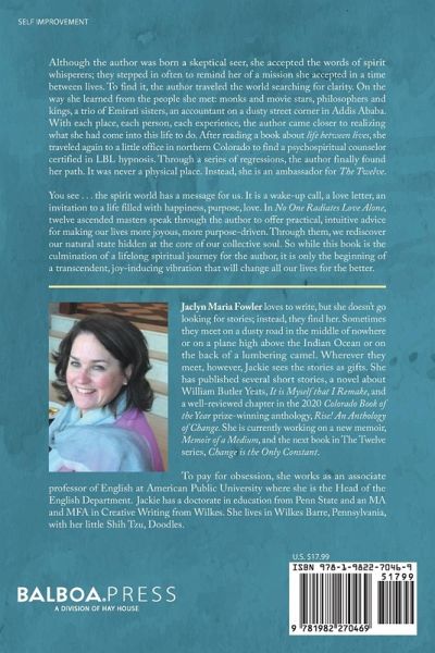 Although the author was born a skeptical seer, she accepted the words of spirit whisperers; they stepped in often to remind her of a mission she accepted in a time between lives. To find it, the author traveled the world searching for clarity. On the way she learned from the people she met: monks and movie stars, philosophers and kings, a trio of Emirati sisters, an accountant on a dusty street corner in Addis Ababa. With each place, each person, each experience, the author came closer to realizing what she had come into this life to do. After reading a book about life between lives, she traveled again to a little office in northern Colorado to find a psychospiritual counselor certified in LBL hypnosis. Through a series of regressions, the author finally found her path. It was never a physical place. Instead, she is an ambassador for The Twelve. You see . . . the spirit world has a message for us. It is a wake-up call, a love letter, an invitation to a life filled with happiness, purpose, love. In No One Radiates Love Alone, twelve ascended masters speak through the author to offer practical, intuitive advice for making our lives more joyous, more purpose-driven. Through them, we rediscover our natural state hidden at the core of our collective soul. So while this book is the culmination of a lifelong spiritual journey for the author, it is only the beginning of a transcendent, joy-inducing vibration that will change all our lives for the better.