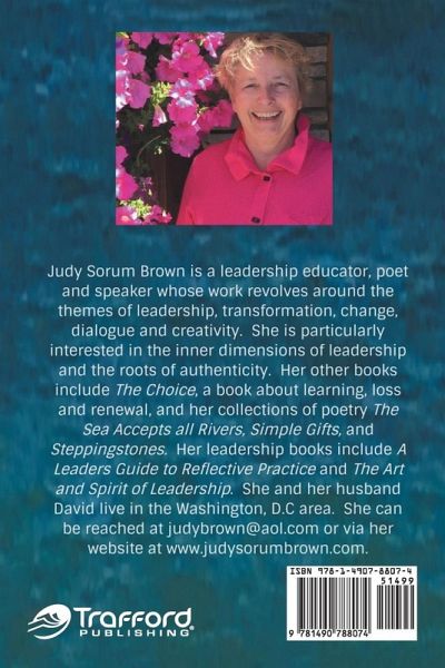 Judy Brown is a poet, leadership educator, writer and speaker, with a passion for helping people uncover their gifts and connect with one another. A native of northwestern Michigan, she writes from a deep love of the natural world and an appreciation for the power of place. Her poetry focuses on transitions and learning from nature. Her leadership work is in the fields of the arts, government, health and elder services. She holds a PhD in Comparative Literature, is a former White House Fellow, and has been affiliated with The Aspen Institute and The University of Maryland. Her other books include The Choice, The Sea Accepts All Rivers, A Leader's Guide to Reflective Practice, Simple Gifts, The Art and Spirit of Leadership, and Flourishing Enterprise: The New Spirit of Business (with co-author Chris Laszlo and other colleagues at the Fowler Center at Case Western Reserve University). She lives with her husband David on a small tidal creek near the Chesapeake Bay, where they can kayak off their front lawn.
