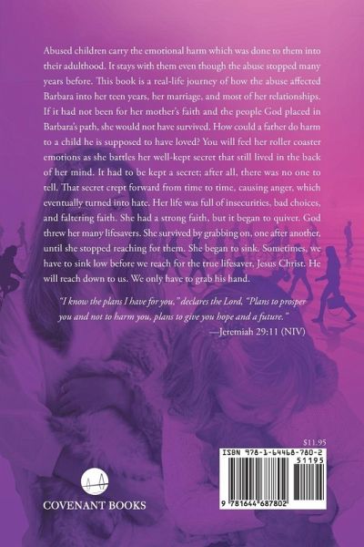 Abused children carry the emotional harm which was done to them into their adulthood. It stays with them even though the abuse stopped many years before. This book is a real-life journey of how the abuse affected Barbara into her teen years, her marriage, and most of her relationships. If it had not been for her mother's faith and the people God placed in Barbara's path, she would not have survived. How could a father do harm to a child he is supposed to have loved? You will feel her roller coaster emotions as she battles her well-kept secret that still lived in the back of her mind. It had to be kept a secret; after all, there was no one to tell. That secret crept forward from time to time, causing anger, which eventually turned into hate. Her life was full of insecurities, bad choices, and faltering faith. She had a strong faith, but it began to quiver. God threw her many lifesavers. She survived by grabbing on, one after another, until she stopped reaching for them. She began to sink. Sometimes, we have to sink low before we reach for the true lifesaver, Jesus Christ. He will reach down to us. We only have to grab his hand. "I know the plans I have for you," declares the Lord, "Plans to prosper you and not to harm you, plans to give you hope and a future." -Jeremiah 29:11 (NIV)