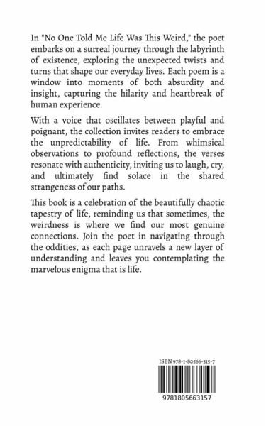 In "No One Told Me Life Was This Weird," the poet embarks on a surreal journey through the labyrinth of existence, exploring the unexpected twists and turns that shape our everyday lives. Each poem is a window into moments of both absurdity and insight, capturing the hilarity and heartbreak of human experience. With a voice that oscillates between playful and poignant, the collection invites readers to embrace the unpredictability of life. From whimsical observations to profound reflections, the verses resonate with authenticity, inviting us to laugh, cry, and ultimately find solace in the shared strangeness of our paths. This book is a celebration of the beautifully chaotic tapestry of life, reminding us that sometimes, the weirdness is where we find our most genuine connections. Join the poet in navigating through the oddities, as each page unravels a new layer of understanding and leaves you contemplating the marvelous enigma that is life.