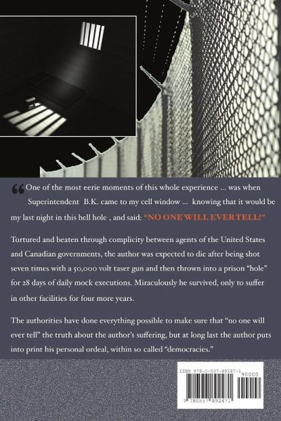 "One of the most eerie moments of this whole experience... was when (Superintendent) B.K. came to my cell window... (knowing that it would be my last night in this hell hole), and said: 'NO ONE WILL EVER TELL!'" Tortured and beaten through complicity between agents of the U.S. and Canadian governments, the author was expected to die after being shot seven times with a 50,000 volt taser gun and then thrown into a prison "hole" for 28 days of daily mock executions. Miraculously, he survived, only to suffer in other facilities for four more years.