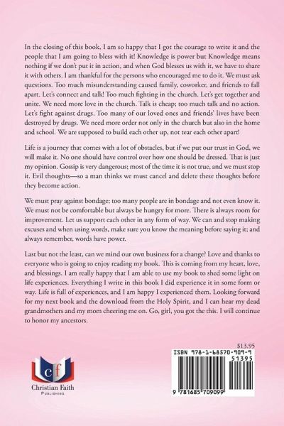 In the closing of this book, I am so happy that I got the courage to write it and the people that I am going to bless with it! Knowledge is power but Knowledge means nothing if we don't put it in action, and when God blesses us with it, we have to share it with others. I am thankful for the persons who encouraged me to do it. We must ask questions. Too much misunderstanding caused family, coworker, and friends to fall apart. Let's connect and talk! Too much fighting in the church. Let's get together and unite. We need more love in the church. Talk is cheap; too much talk and no action. Let's fight against drugs. Too many of our loved ones and friends' lives have been destroyed by drugs. We need more order not only in the church but also in the home and school. We are supposed to build each other up, not tear each other apart! Life is a journey that comes with a lot of obstacles, but if we put our trust in God, we will make it. No one should have control over how one should be dressed. That is just my opinion. Gossip is very dangerous; most of the time it is not true, and we must stop it. Evil thoughts--so a man thinks we must cancel and delete these thoughts before they become action. We must pray against bondage; too many people are in bondage and not even know it. We must not be comfortable but always be hungry for more. There is always room for improvement. Let us support each other in any form of way. We can and stop making excuses and when using words, make sure you know the meaning before saying it; and always remember, words have power. Last but not the least, can we mind our own business for a change? Love and thanks to everyone who is going to enjoy reading my book. This is coming from my heart, love, and blessings. I am really happy that I am able to use my book to shed some light on life experiences. Everything I write in this book I did experience it in some form or way. Life is full of experiences, and I am happy I experienced them. Looking forward for my next book and the download from the Holy Spirit, and I can hear my dead grandmothers and my mom cheering me on. Go, girl, you got the this. I will continue to honor my ancestors.