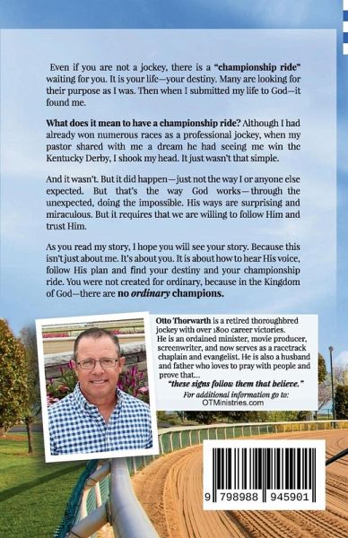 Even if you are not a jockey, there is a "championship ride" waiting for you. It is your life-- your destiny. Many are looking for their purpose as Otto was. Then when he submitted his life to God--it found him. What does it mean to have a championship ride? Although Otto had already won numerous races as a professional jockey, when his pastor shared with him a dream he had of seeing Otto win the Kentucky Derby, he shook his head. It just wasn't that simple. And it wasn't. But it did happen-- just not the way Otto or anyone else expected. But that's the way God works-- through the unexpected, doing the impossible. His ways are surprising and miraculous. But it requires that we are willing to follow Him and trust Him. As you read Otto's story, the hope is that you see your story. Because this isn't just about Otto. It's about you. It is about how to hear His voice, follow His plan, and find your destiny and your championship ride. You were not created for ordinary, because in the Kingdom of God-- there are no ordinary champions.