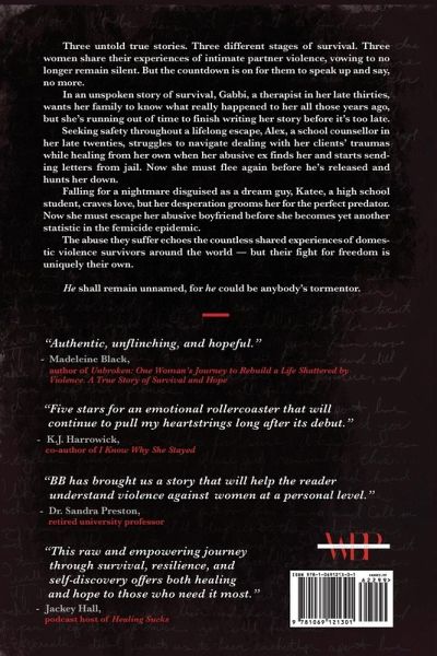 Three untold, true stories. Three different stages of survival. Three women share their experiences of intimate partner violence, vowing to no longer remain silent. But the countdown is on for them to speak up and say, no more. In an unspoken story of survival, Gabbi, a therapist in her late thirties, wants her family to know what really happened to her all those years ago, but she's running out of time to finish writing her story before it's too late. Seeking safety throughout a lifelong escape, Alex, a school counsellor in her late twenties, struggles to navigate dealing with her clients' traumas while healing from her own when her abusive ex finds her and starts sending letters from jail. Now she must flee again before he's released and hunts her down. Falling for a nightmare disguised as a dream guy, Katee, a high school student, craves love, but her desperation grooms her for the perfect predator. Now she must escape her abusive boyfriend before she becomes yet another statistic in the femicide epidemic. The abuse they suffer echoes the countless shared experiences of domestic violence survivors around the world, but their fight for freedom is uniquely their own. He shall remain unnamed, for he could be anybody's tormentor.